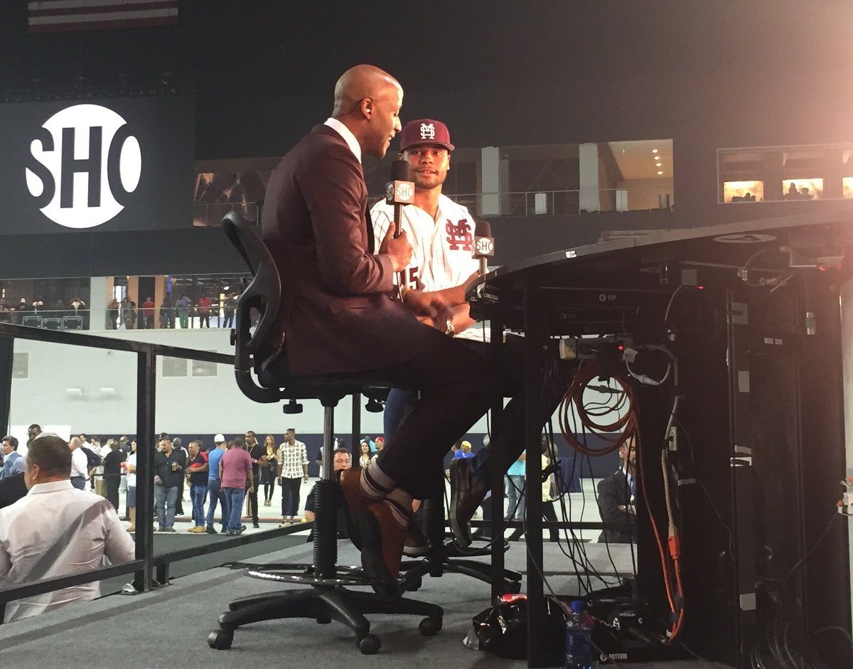 Dak repping MSU for an interview during a fight at the Ford Center in Dallas on Showtime