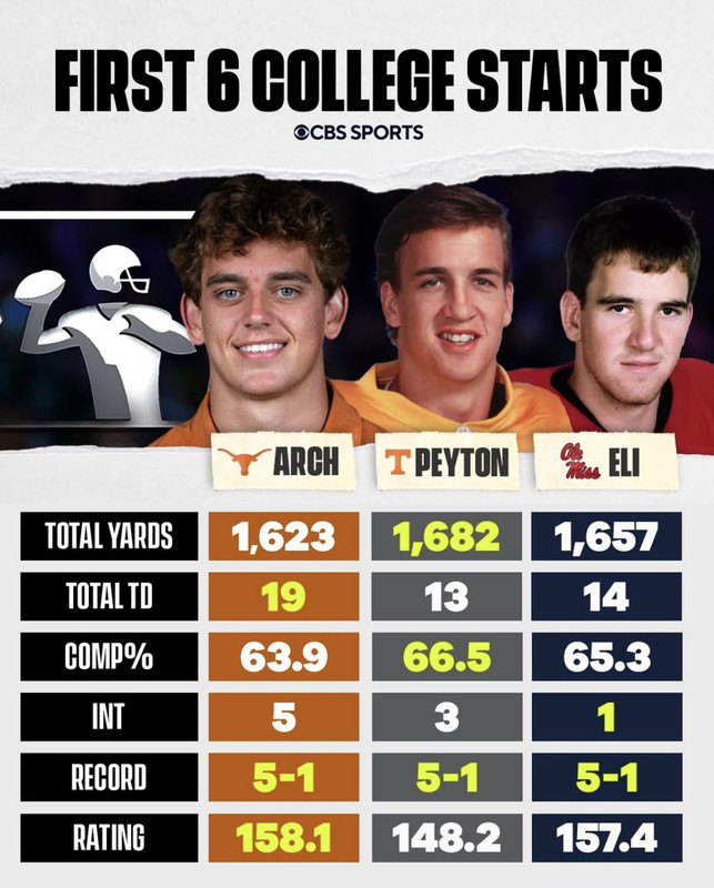 I saw online yesterday, didn’t verify so I don’t know how accurate, but through 6 games as a starter, Arch has almost identical stats as Peyton and Eli. Wish I knew where I saw that…